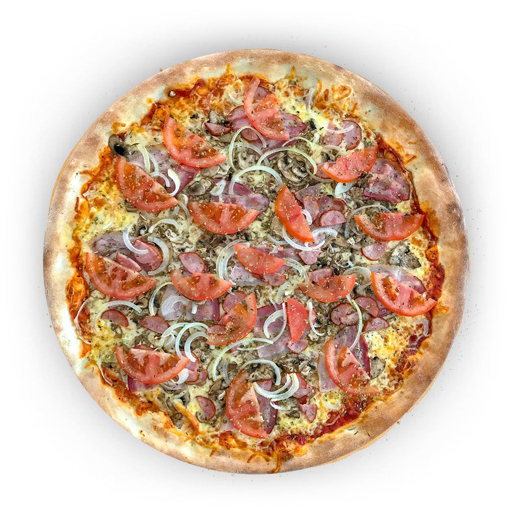 ser, boczek, kiełbasa, pieczarki, pomidor, cebula, oregano