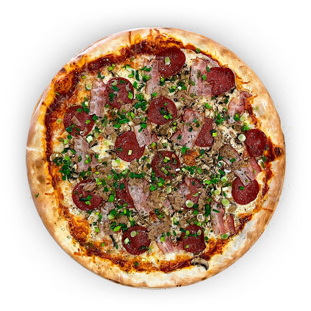 ser, boczek, salami, tuńczyk, pieczarki, czosnek świeży, bazylia, szczypiorek, oregano