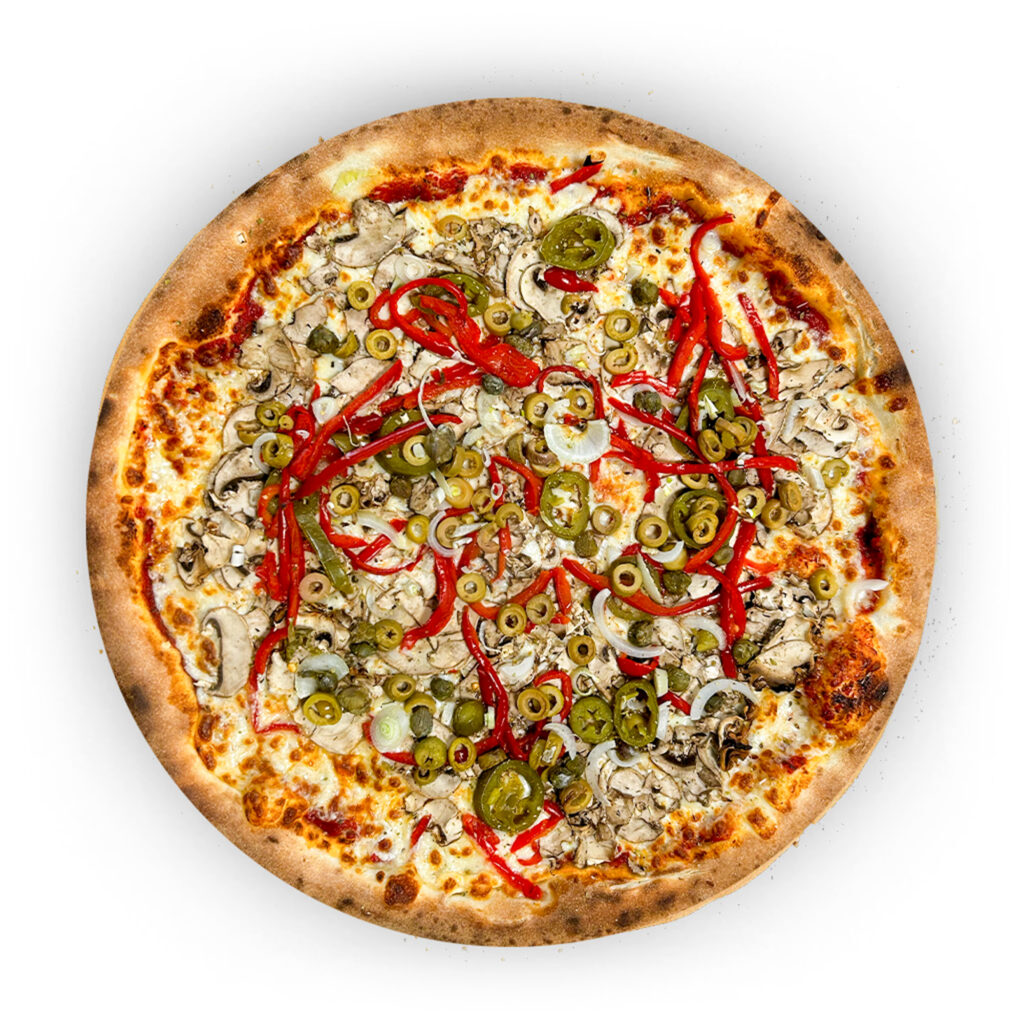 ser, pieczarki, ostre papryczki chilli, kapary, cebula czerwona, oliwki krojone, papryka, oregano