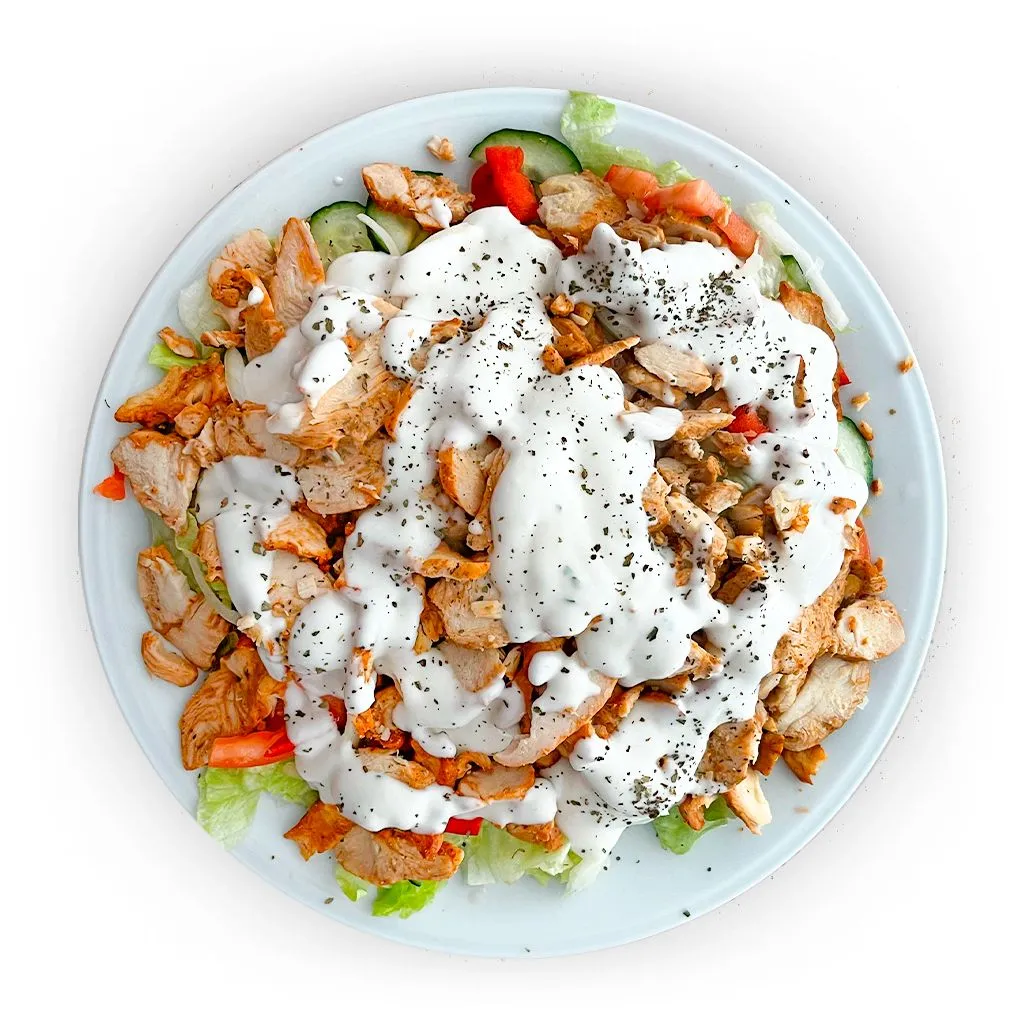 gyros, pomidor, papryka, ogórek, sałata lodowa, sos czosnkowy