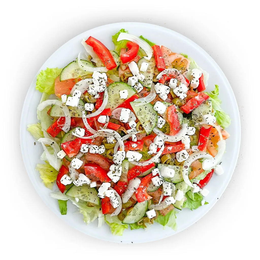 sałata lodowa, pomidor, ogórek, feta, papryka, cebula, oliwki, sos winegret
